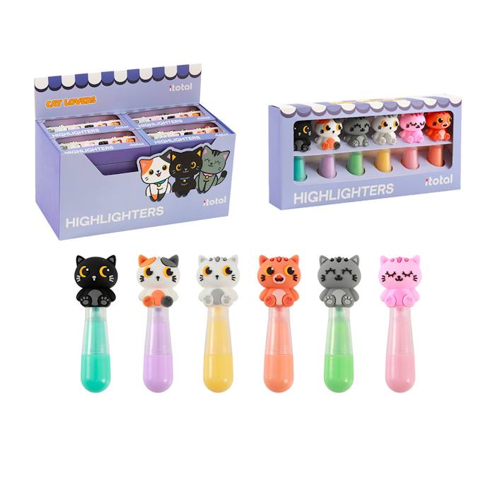 Set con sei mini evidenziatori pastello con topper a tema gatto.